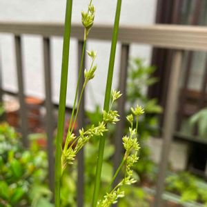 いつの頃からか知らないうちに我が家に咲いています🌱 5〜6年いやもっと前から2カ所に育ってます。硬くて細く上に伸びて1m位になります。 なんの花か分かりますか? 家の中で使います。 今日、ホームセンターで見つけて名前が判明しました。 やはり、思ってた通りでした。 水辺に育つ植物です🌱 畳の原料の「い草」でした🤗