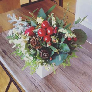 クリスマスアレンジの見本を作りました。 インテリアショップでワークショップをさせていただく告知用の写真です。