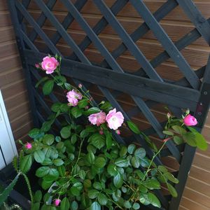 1年目のツルバラのアンジェラ。 伸びて花咲いたので、ラティスに誘引し、タイラップで固定しました。 仄かにいい匂いがします。