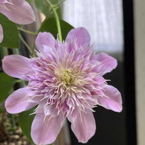 挿し木のクレマチス ジョセフィーヌ ガクが花びらのように開いてほぼ全開 窓の外は昨日降った雪で真っ白に ①②クレマチス ジョセフィーヌ