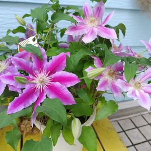 今日のクレマチス第二弾💖 続投します😙 ジョセフィーヌです 昨年【まつおえんげい】さんから来た娘です お隣さんとの境界フェンスにワイヤーで止めつけています🤗 新旧枝咲きタイプということで 試しに昨年の蔓を2メートルほど残しておきました(画像3) いろんなところから(株元からも)芽吹いて蔓も3メートルほどになり こんな形で咲いています 画像の右にも伸びて咲いているのですが 広がり過ぎで写りませんでした😅 もっとかっこよく誘引したいのですが うっかりするとポキッと折れてしまうのでうまく行きませんねぇ(^◇^;) あと2年くらい頑張ったら ゴージャスで見栄えがするフェンスになるかしら❓😉 *\(^o^)/*