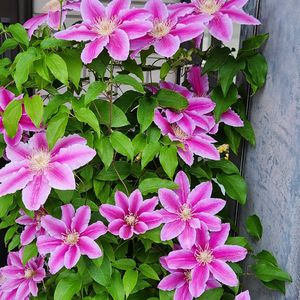 こんばんは😃🌃 クレマチスが次々咲いてきました🩷💜💚 旧枝咲きは剪定の位置がよくわからなくて、バランスが悪いです😅💦