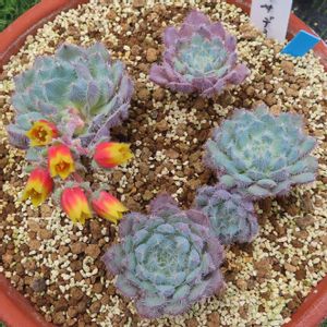 群生化して大きくなったセトーサデミヌタの先端を4つカットして挿して作ったもけもけ丼。 1つにだけ花がさいて,別の1つにだけ子株ができた。どういうわけか,他の2つは外側の葉の紫が濃い色のまま。