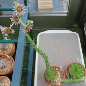 先週投稿したセンペルビウムのラズベリーアイスのその後。花芽が盛大に伸びて先端からつぼみがいっぱい出てきた。期待通り派手に咲きそう。 株分けしたもう1つの株も花芽が伸びてきたので,株を残すためこっちは早めにカット。けど,生き残るかどうかはわかならい。