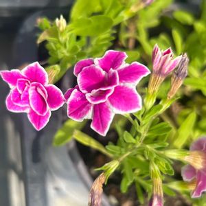おはようございます☀ 新入り2つを含め、うちのペチュニア系勢揃い! 小さい丸から紹介しますね。 右上 新入りのスーパーチュニアビスタミニピンクスター。 その横 ミリオンベルイエロー。 左下 スーパーチュニアサクラフロート。 その横 スーパーベルダブルピンクリップル。 大きい丸は新入りのスーパーチュニアロイヤルベルベット。 ⬅️真っ黒でタグと違うと思ったら➡️2日目で普通の紫になりました。
