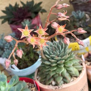 休眠前のアエオニウム🍃🌱 皆んな大きくなって手狭になってきたねぇ〰️😊💖 黒法師 レモネード 伊達法師 サンバースト 小人の祭り(黒法師で見えてない) もう植え替えはギリ心配なので秋にはおひとり様にしょうかな〰️…🤔💭