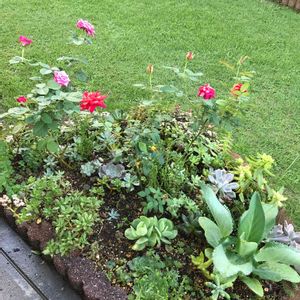 おはようございます🙂 台風🌀15号は昨夜12時を過ぎた頃から雨風強くなり眠れないまま朝に…… 今は風はあるけど雨は止んでいます。 そして今日は台風一過になりそう〰️36℃予報😱 地植えポイポイ花壇の今。 土が見えてる所はいつの間にか消えてしまった多肉達。