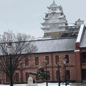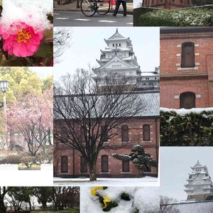 雪が降った No.2 姫路城周辺はうっすらと雪 山茶花もベンチもパンジーもうっすら雪化粧❄️寒くても、人力車のお兄さん頑張ってます