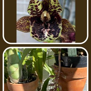 🌸垂れ下がりティンマン🌸 Clowesia Joe Betts 'Tin Man'    Cl.warscewiczii x Cl.russelliana 二房から更に一房🌸 ティンマンは育て易く花芽を沢山上げます☺️ グリーンストライプの花弁に微かに縁どるペールピンクがとても爽やかで花凛なカタセタムです🌸 香りもあり楽しませてくれます😊 成長期とても水を好み与えれば与える程バルブを太らせます💦💦💦 プクプク太った丸みのあるバルブも堪りません🥰 🌸雑談 冬場の栽培に於いてだいたいの株は花期を迎え休暇期に入るのですが中には成長途中の株や成長期がズレてしまった株もあります。 この場合水遣りや肥料はどうするか? 栽培環境が温度湿度管理がなされた環境(温室)なら水遣りも肥料の効き具合も問題なくやれますが💦 一般的な室内栽培では特に気温が低いと水遣りは気を遣い肥料も乾燥して悪影響を及ばす事もあります。 💦対策として 💧水遣りは 夏場と違い水分の蒸発は少ないので頻繁にやる必要は無くしっかり乾いていたら暖かい日中にしっかりやり後は湿度調整で霧吹き散布💦💦💦 例え成長が悪くても次に期待しましょう🌱 肥料は前もって成長度合いを見て肥培管理をします。 油粕などは効能は素晴らしいのですがあまり長く置くと変性してかえって逆効果になる場合もあるので有効期間が過ぎたら排除します。 科学肥料は有効期限も無く効能が切れても問題無いものが多いので成長が遅い又は遅れている株は肥料特性も考えて与えて下さい😊