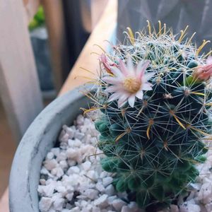 おはようございます☀ 🪴🪴🪴🪴🪴🪴🪴🪴🪴🪴 ピリフェラ錦です 子株わらわら系ですけど 皆は子株取るのかな? 形良くならなそうだし😑😑 かなり無理あるけど🙌 トルツオスムの花がおじゃま しています💦💦💦💦💦