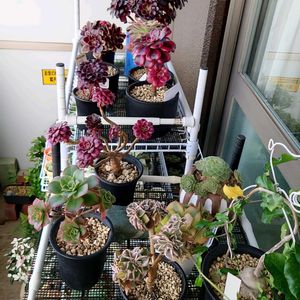 おはようございます ☀️ 🪴 アエオニウム 休眠しているのかはっきりしなくて😅 まだ水をあげてます 🥹 シワのあるもの、ピンクウイッチが 紫ウイッチへ😨色の薄いのは室内へ、 😑明日が最後の水やりだっ!たぶん、、