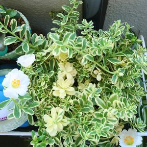 おはようございます ☀️ 💮白斑入りポーチュラカ ミルク&ハニー 先のポーチュラカ 華ミステリア 😅生産者さんの名付け?に追加です 一日花?と言うんですか?毎日 3つ4つ咲いてくれます、花数少なくても 斑入りの葉が綺麗なので 👍 🏷️斑入り見つけ隊♪ 🏷️2のつく日は斑入りの日