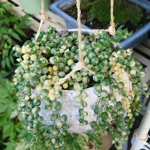 おはようございます ☀️ 🌿 斑入りグリーンネックレス いつも枯らしてしまうけど吊るしたら いい感じです 😁 👀てっぺんは空いた方がいいのかな? 蒸れそうですね 😔✂️ 🏷️つぶつぶの日 🏷️斑入り見つけ隊♪ 15番