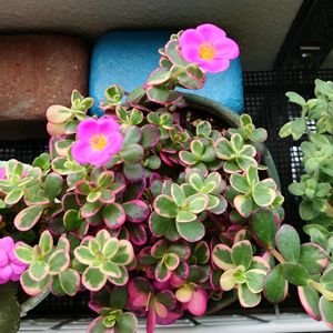 おはようございます 🔥もう暑い😆 💮斑入りポーチュラカ 華ミステリア 買った時は真っ赤だったけど 少しづつみどりん化してきてます😗 このポーチュラカは朝から毎日一つ二つ 咲いてくれるので花が見れますね 👍 前にあったのは仕事中にしか咲かなくて😅 🏷️斑入り見つけ隊♪