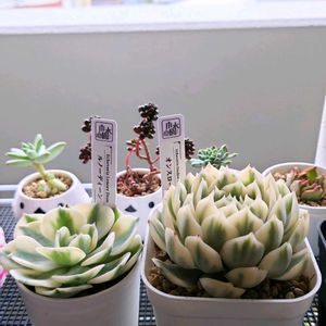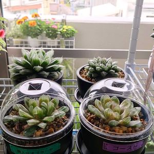 おはようございます ☀️ 🪴 ハオルチア 斑入りオブツーサ ゴースト 植え替え、仕立て直し、失敗した模様😅 陽に当てすぎたかも、葉は硬いので とりあえず膨らまし作戦です 😆 左奥 白うさぎ 右奥 ミラーボール です 🏷️つぶつぶの日