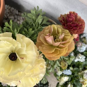 今日の1鉢。 春らしく優しい色でまとめてみました。 個人的に大満足ww #ラナンキュラス トワイライトレディ #アネモネ ポルト #ローダンセマム アプリコットジャム #プリムラジュリアン スウィートピンク #ネメシアメーテル 小春
