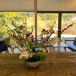 春のお花を使ったアレンジメント💐 白と紫で大人っぽく💫 下の中心から自然に生えているかのようにイメージしてやっていくのですがこれまた難しいのです。中心を意識しすぎると上のバランスが崩れていき、、💦思っていたより大変でした、、😨 スイートピーがとてもいい匂いで癒されます🥰