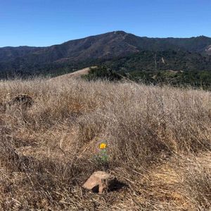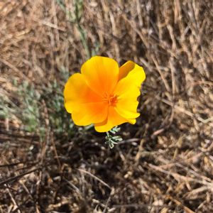 乾季で枯れ草に覆われている丘の頂きで、一輪だけ咲いていた季節外れのカリフォルニアポピーを見つけました。