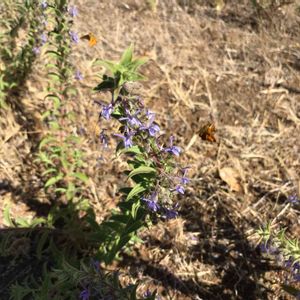 乾季で枯れ草ばかりの丘で咲いていた花に蝶が群がっていました。Vinegarweedと言うそうです。学名は Trichostema lanceolatum だそうです。