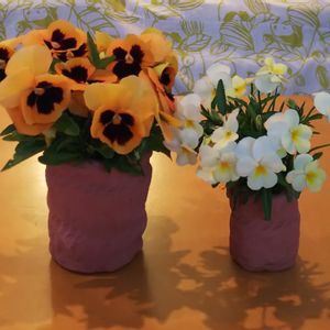 子供が学校で縄文土器🏺❔を作ってきました🤭 一応、花瓶だというので、使わせてもらいました😊💝 今日の暑さで、ビオラとパンジーがダラ~と垂れてしまったので、思いきって切って生けました💐😆💦