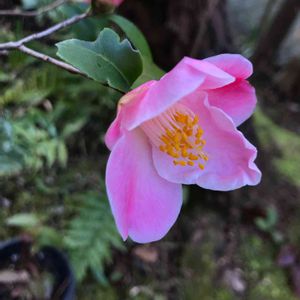 おはようございます😃 ちょっとイメージの違う椿です。 ミニ椿だと思います。🤔 皆さんの投稿写真から、港の曙という椿だと思われます。 よい香りがします。 花びらが3枚に見える時があります。 3枚ずつ二段に咲くようです。 タグを変えさせていただきます。😊 葉っぱも花もミニです。 花を見ると、花びらの数も分かりにくい形状です。 ただ、筒シベの様子はやはり椿と思わせます。🧐 蕾は細長く、花と同じようにピンク色です。 椿とサザンカとの交配種のようです。 枝ぶりもムクゲなどを思わせる形で、 藪椿とはだいぶ雰囲気が違います。🤔 花数が多くて、可愛らしいです。😊