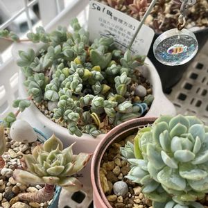20250126 📢ちゃまさんからの素敵便が届きました✨️📢素敵な苗を沢山頂きもうテンション爆上がり🤩暖かいので速攻植え付けです⛏️ ①すんごい立派なブルーベリームーンさん😍花芽もいっぱい出来てます。植え替えしたから花咲くかなぁ💦 ②はじまりの花さん。こちらはミニマ交配?かわいらしい葉がみっちりついて、コロンコロンで可愛い🥰植え付けてから気づいたけれど、少し木立ち風に植え付けたほうが良かったのかな💦 ③夕波さん。こちらも本物は初めてみました🔰高砂の翁の親戚?大きくなりそうです👍 ④うぐいすさん。これもかわいくなりそう。ネーミングも素敵だと思いませんか? ⑤おはな、スプワン×乙女心、さくらもちのつぶつぶ寄せ。寄せ植えするたびに自分のセンスの無さを痛感します😭とりあえず美しさよりモリモリ元気を目指します💪 どれもネットでしか見たことのない貴重な苗をありがとうございました🥰🥰🥰