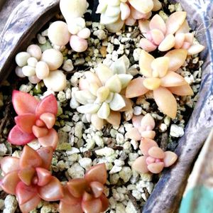 多肉植物 寄せ植え風 葉挿しを並べて管理したら寄せ植え風に🎶 白牡丹が綺麗に紅葉してくれました。 白牡丹 姫秋麗 ルビーネックレス 裏にアモエナ 今日の作業 葉挿しの植え替え