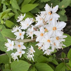 マルバウツギ(丸葉空木)が咲いていました。 アジサイ科で、小さい白い約1cmの星形をした花✨ 葉がほかのウツギより丸いのがポイント🎶 花の中にオレンジ色の輪🟠があるのが特徴です💕😃