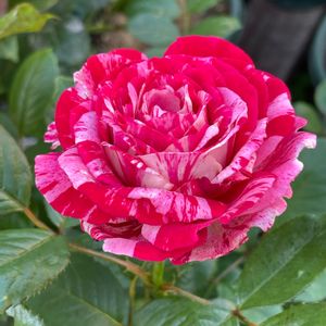 🌹落葉低木 四季咲きばら センチメンタル ( 🇺🇸 Scentimental ) こんにちは🍀 大雨警報の地域の皆さま くれぐれもお気をつけください💠 紅白❤️🤍のマーブル模様•*✨ 挿し木して3年目🗓 立派な株に育ち 本株と同じくらい華やかで 香りも良くて 大好きなバラです😊 🏷月曜日にはバラを 参加します♡