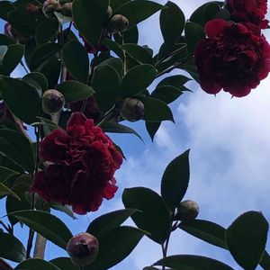 我が家の庭の、 南蛮紅椿が満開。 まだ蕾がたくさんあるわ、大輪できれい。 冷えた朝の大阪・高槻です。