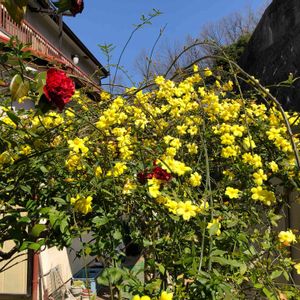 春めいた大阪・高槻の朝 蝋梅もどきの黄色い花が満開です そこに上から覗き込むように南蛮紅椿が顔を覗かせています なんか、嬉しいなぁ。