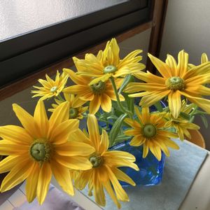 ☆お出掛け先の生花☆ *ルドベキア 花瓶に生けられていたお花、 造花だと思って近づいたら 生のお花でした〜 パッと明るく夏を感じる とってもきれいなお花です😍