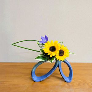 本日のお稽古 自由花 前から使ってみたかった花器で生けてみました。 私はこの花器を青いプレッツェルと呼んでいます。 このプレッツェルのような輪っかの形状を同じようにフトイを曲げて複数配置しました。ナルコユリの葉っぱの形も同じような形なので、統一感を出しています。 もう少し沢山のフトイを入れたかったのですが、挿口が小さいので、これ以上入れるとオアシス崩壊しそうで止めておきました😆 短かった梅雨は終わり、ひまわりの季節ですね🌻🌻