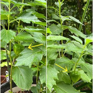 おはようございます。薄曇り、23.0℃、ちょうどいい。ホオヅキ、花が咲き、実もできてます。路地販売でジャンボひまわりが売っていたので購入、苗植えしました。プランター植えの中玉トマト、ミニトマトの支柱立てをしました。のらぼう菜の種採りをしました。😻🥰😍😸😋☺️