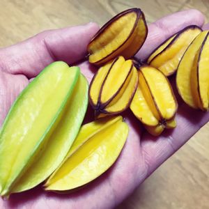 スターフルーツ⭐️ 手前の2個はカレー、奥は紅龍。 うーん、香りは熟して甘みはあるんだけど、エグミ?渋みが強い… 手前の大きめのカレーが甘くなることを願っているところです。