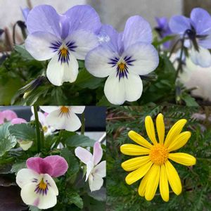 今の時期、うちの庭で咲いてる花 と言うとどうしても ビオラやパンジーになってしまいます💦 少し前までブルーだけだった 色変わりビオラ 今は白とブルー半々で咲いています。 左下は 春の恋 隣りはユリオプスデージー 鮮やかな黄色にハッとさせられます💛