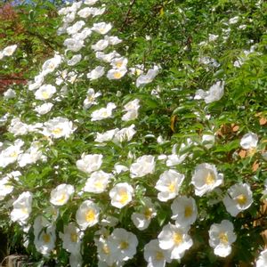 ナニワイバラ 我が家の外壁に今が盛りとばかりに咲き誇る♡ あっという間に散りゆくビューティフルサンデー❇️ 100本以上ある雄しべが、オレンジ色に平たくなって見える雌しべを囲んでいる🟠 放って置けばどんどんと枝を伸ばして道に飛び出していくのでガンガン伐って、紐でラティスに結んで誘引していくのだけれど、なにしろ刺がすごいので、毎年大変😖⚡️