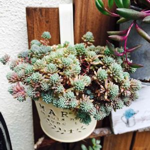 かなりお久しぶりです! かわいい(о´∀`о) なんてかわいい色になってきたの💜💗💚 小さいタイプの子達の 寄せ植えというかぶっ込み的な😆❤️ どれがどれだかわからないので 名前つけてる場所は適当です。 種類はあってるはず。😅