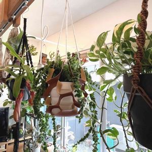 いきなりの猛暑☀️ ベランダのお花とグリーンが心配です💦 窓ぎわに吊るしてるエスキナンサス もうすぐ3年目のマルモラタスはモリモリ元気です🌿 エスキナンサスの仲間 コドナンテ クラシフォリア この子はそろそろ2年目で同じく元気 奥のエスキナンサス モナリザ 元気で枝の先っぽは伸びるけど 根元のほうから葉っぱが落ちてしまってブサイクな形です💦 ほかのエスキナンサスはうーん( •́ .̫ •̀ )な感じ💧 うちにお連れしてもなかなか元気よく育たないので もうエスキナンサスをお迎えするのやめようかな🥹