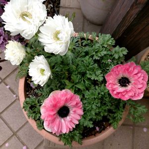 【1枚目】実家の葉牡丹も美しくとう立ちしております🥰💕 【2枚目】先日、お彼岸のお墓参りに行ってきました。 今年は色が偏っちゃって淋しい感じになってしまいました😢 花屋さんで買い足そうと提案しましたが却下されました。物価高ですしねー😅 来年は高性種を色とりどりでもっと育てよう! と母とやる気を共有しました。がんばるぞー!💪😁💪 【3枚目】球根からのアネモネちゃんが開花してきました! 嬉しい!😆💕 デカンピンクのマゼンダ色がとっても好きです😍 デカンブルーは3月12日に開花投稿していまして、その咲き終わりなのでかなり色褪せてしまいました。 ミストラルワインは紫色でした。ワイン色のもあるんだけど、あと2株から出てくれるかな?🤔 【4枚目】今か今かと日々のぞいていたラナンキュラスについに蕾が!😆👍 一番乗りは昨季に苗で購入した2年目のテネラさんでした。早く渋いブラウンカラーが見たいです!🤩 他はまだですが、今月中には蕾発見できるんじゃないかなと予想しています。楽しみ😚 【5枚目】今年購入した八重アネモネはお日様に照らされてパッカーンと開いております🤭 白八重のアネモネがキラキラしてとっても綺麗です😍 やっと暖かくなるみたいですね。いろいろなものが一気に咲いてきそうで楽しみです😚💕