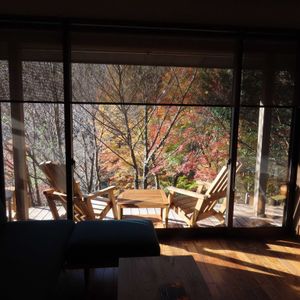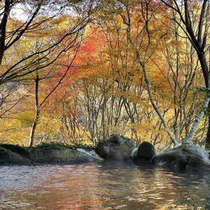熊本旅行から 〈古天神〉〜⑵ (携帯写真編) 湯船に映り込む紅葉 貸し切り湯の温めのお湯♨️は ずーっと紅葉を眺めながら 浸かっていたくなる🍁 5月に来た時のこのお風呂は ホタルが舞う、ホタル見風呂でした✨ 2025.11.22