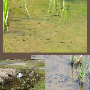 藺牟田池から オタマジャクシの池 ♪♪ コブハクチョウが乱入!! まさかオタマジャクシを食べている⁇ 泥の中に顔を突っ込んでいる様子だからオタマジャクシではないようです♡ カエルの合唱が聞こえて来るのに姿は見えず😢 足のある子も見当たらず!