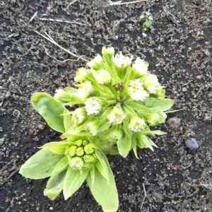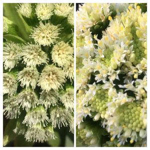 フキノトウ フキは雌雄異株です フキノトウの花をわかりやすく アップで撮りました 左は雌株の花(白い) 右は雄株の花(ちょっと黄色っぽい) 雄株の花は枯れてしまいますが雌株の花は 綿毛になって飛んで行きます。