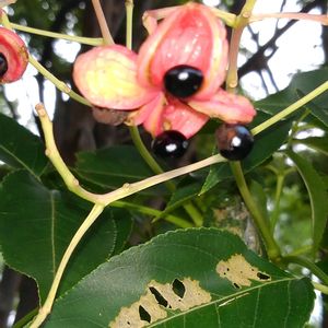 ゴンズイの果実です(2025.7.5🤳) 果皮は肉質で厚く 生長してくると重いので枝が垂れてきました 少し赤く色づいてきています! 早くも裂開して種子が見えるものもありますが この時点ではさすがにまだ黒くはありません 2025.5.20 pic upした地味なお花からは思いがけない変身です!😡 これからもしばらく目が離せません!🤣