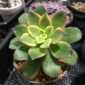 アエオニウム 夕映え いつ紅葉するのかな?🍁と思ってましたが、今頃になって葉先が少しピンク色になって来ました。 外に出してあげたいけど、今年いっぱいは日中もお日様が望めないようです。 頑張って色付いて欲しいです。 頑張れ!夕映えさん☀️