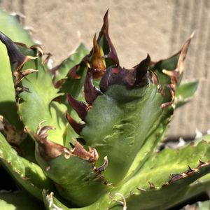 昨日に続き 今日もアガベの投稿です お迎えして もうすぐ一年になる アガベ チタノタ レッドキャット ウィーズルお迎え時の表示は ゴリ猫です❢ 春~ずっと 南側ベランダの 一番長く 陽のあたる場所に 置いていましたが 水や肥料を あげ過ぎたのか 徒長して しまっているみたい(;´∀`) それよりも 新たに出て来そうな葉が 何か変🤔 画像2枚目の 下の方から 出て来ている トップスピンが 見えますが その上に 被るように 薄緑色の 長い塊。。。o(゚^ ゚)ウーン 更に 3枚目の 出かかっている トップスピンの 下の葉が 尖端に 棘が無ければ ピーマンの様な 丸っこい感じ(-ω-;)ウーン 画像2枚目の薄緑のも 棘なのかな? ピーマンみたいな 丸っこい葉は きちんと出て来てくれるのかな?