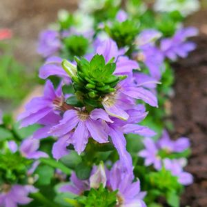 ブルーファンフラワー (サンクエール) 花は小さくくさび形の花びら 扇状に並んだ形… 初めて育てています… 1年を通して開花するとか…♡