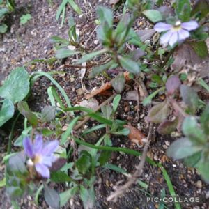 グランドカバーに植えた小さなスカエボラも落ち葉に埋もれながらまだ咲いています 日照時間が短くあまり良い環境ではありませんが増えて欲しいなぁ❣️ 花言葉は可能性🤩 這性耐寒性多年草の可能性に期待します🎶 青花のつもりでしたがもしかしてピンク❓🙄