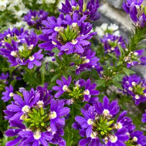 今晩は🤗🌟⭐️ 今日も一日お疲れ様でした♪(๑ᴖ◡ᴖ๑)♪💙💜🌟❄️🌟💜💙 ◎ ブルーファンフラワー 学名:Scaevola aemula 別名:スカエボラ 科名:クサトベラ科 分類:多年草(常緑)、一年草扱い 原産地:オーストラリア 大きさ:背丈15~30cm、横幅30~50cm 主な見所:花(5~11月) 扇や天狗のうちわのような独特な形の花。紫~青紫色の花色が涼しげな印象ですが暑さには強いです。花は短い花穂に円状につきます。花つきは良好で、雨に当てなければ花もちも優れています。葉は小さめで鋸歯が目立ちます。株は横に広がるように伸び草丈は高くなりません。半耐寒性ですが、南関東以西の暖地なら陽だまりの軒下などで冬越し可能です とっても可愛い青紫色の小さな花です🥰🥰👍 🏷 (祝)青い花マニア4周年 🏷 青い小さな花マニア (2021年10月撮影) 🌟💙❄️💜❄️☆*:.。. o(≧▽≦)o .。.:*☆❄️💜❄️💙🌟