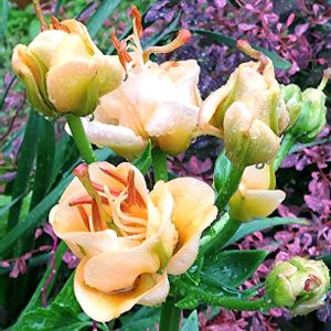 変わったユリに出会いました。 チューリップのようなカップ型で薔薇のように八重咲きになってます。 アプリコットカラーで何だかスイートな名前です 奥に見える白いぽつぽつはドクダミです。